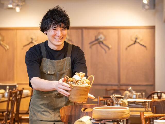 当社との接点は新卒向けの合同説明会。どこのブースよりも大きな声を出している企業があり、気になってのぞいたのが当社だったという。店舗で働く先輩社員の姿・スタッフとお客様の適度な距離感・産地を意識した料理に魅力を感じ入社を決意。2024年4月より裏の山の木の子の店長を務める。