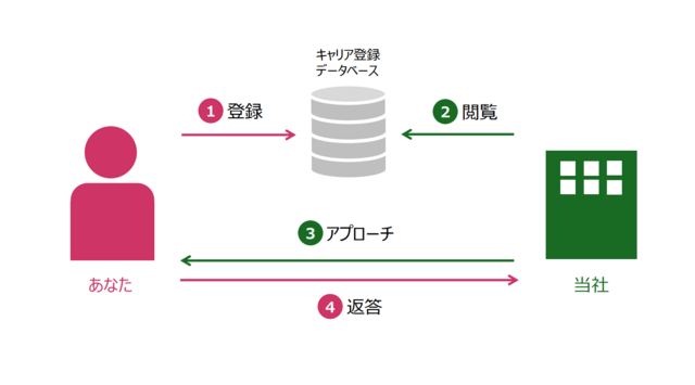当社へのご転職を少しでもお考えの方が、ご自身のキャリア(職務経歴)をご登録いただくことからスタートし、その後、あなたのスキルやご経験にマッチする職種の募集がある場合、当社から都度その職種をご紹介する制度です。