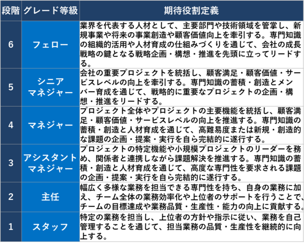 当社では、社員一人ひとりに期待される役割を基準として、6段階のグレード等級を設定する役割等級制度を導入しています。年齢や勤続年数ではなく、責任の範囲、期待される役割遂行のプロセスや成果を基準にグレード等級を設定することで、公正で納得感のあるキャリア形成を実現しています。
