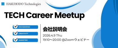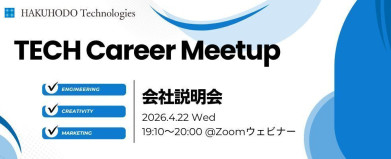 クリエイティビティと、テクノロジーの融合をリードするテクノロジー戦略組織 博報堂DYグループは「生活者発想を基軸に、クリエイティビティ、 統合力、 データ/テクノロジー活用力を融合することで、 オールデジタル時代における企業のマーケティングの進化と、イノベーション創出をリードする。 そのことで、生活者、社会全体に新たな価値とインパクトを与え続ける存在になる。」という基本戦略を掲げています。 そんな博報堂DYグループを、さらなるテクノロジー企業としての企業体に進化させていくために、グループ内のリソースを集約し生まれたのが博報堂テクノロジーズ。リソースの集約によるシナジーの創出、積極的なシステム開発投資、外部人材の登用と育成を軸に、テクノロジー人材にマッチした人事制度、人材マネジメント体系を備えるエンジニアオリエンテッドな組織作りを行っています。 博報堂テクノロジーズの会社説明会を実施します。 当社は、「世界一級のマーケティング×テクノロジー会社になる」というビジョンを掲げています。これを実現するために、博報堂DYグループが培ってきたマーケティングの力と高度なテクノロジーを組み合わせ、マーケティングとテクノロジーの融合領域で市場をリードする仲間を募集しています! そこで今回は、博報堂テクノロジーズについての理解を深めて頂く場としてオンラインでの会社説明会を開催することに致しました。 会社概要 提供するサービスやプロダクト 働く環境、制度について 業務内容、募集ポジション などについて、詳しくお話させていただきます。 博報堂DYグループのアセットを活用した、マーケティングビジネスの変革に興味のあるテクノロジー人材の方々は是非ご参加ください! 【お申し込み方法】 参加をご希望の方は、本ページより事前登録をお願いいたします。 ご登録後、当日のZOOM URLをお送りさせて頂きます。 登録締切:3/25(水)20:00まで(当日参加OKです) スケジュール 2026年3月25日(水)19:10開始(19:05より入室可) 19:10-19:40 会社説明 19:40-19:55 質疑応答 ※コメントで頂く予定です 19:55-20:00 クロージング 参加対象 博報堂テクノロジーズで働くことに興味関心をお持ちの方 (データサイエンティスト・データエンジニア・バックエンドエンジニア・フロントエンドエンジニア・インフラ・クラウド・PM・PdM・コーポレートITなど) 本イベントにご都合悪く参加が難しい方は、別日程の開催も決定しておりますので、こちらもご検討下さい。 ・2026年2月12日(木)19:10開始 https://hrmos.co/pages/hakuhodo-technologies/jobs/2095727344319987758 ・2026年2月25日(水)19:10開始 https://hrmos.co/pages/hakuhodo-technologies/jobs/2095727344319987759 ・2026年3月12日(木)19:10開始 https://hrmos.co/pages/hakuhodo-technologies/jobs/2095727344319987721 ※イベント内容は同様のものになります。 ※イベントは定期的に開催しています。