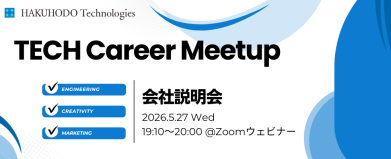 クリエイティビティと、テクノロジーの融合をリードするテクノロジー戦略組織 博報堂DYグループは「生活者発想を基軸に、クリエイティビティ、 統合力、 データ/テクノロジー活用力を融合することで、 オールデジタル時代における企業のマーケティングの進化と、イノベーション創出をリードする。 そのことで、生活者、社会全体に新たな価値とインパクトを与え続ける存在になる。」という基本戦略を掲げています。 そんな博報堂DYグループを、さらなるテクノロジー企業としての企業体に進化させていくために、グループ内のリソースを集約し生まれたのが博報堂テクノロジーズ。リソースの集約によるシナジーの創出、積極的なシステム開発投資、外部人材の登用と育成を軸に、テクノロジー人材にマッチした人事制度、人材マネジメント体系を備えるエンジニアオリエンテッドな組織作りを行っています。 博報堂テクノロジーズの会社説明会を実施します。 当社は、「世界一級のマーケティング×テクノロジー会社になる」というビジョンを掲げています。これを実現するために、博報堂DYグループが培ってきたマーケティングの力と高度なテクノロジーを組み合わせ、マーケティングとテクノロジーの融合領域で市場をリードする仲間を募集しています! そこで今回は、博報堂テクノロジーズについての理解を深めて頂く場としてオンラインでの会社説明会を開催することに致しました。 会社概要 提供するサービスやプロダクト 働く環境、制度について 業務内容、募集ポジション などについて、詳しくお話させていただきます。 博報堂DYグループのアセットを活用した、マーケティングビジネスの変革に興味のあるテクノロジー人材の方々は是非ご参加ください! 【お申し込み方法】 参加をご希望の方は、本ページより事前登録をお願いいたします。 ご登録後、当日のZOOM URLをお送りさせて頂きます。 登録締切:5/14(木)20:00まで(当日参加OKです) スケジュール 2026年5月14日(木)19:10開始(19:05より入室可) 19:10-19:40 会社説明 19:40-19:55 質疑応答 ※コメントで頂く予定です 19:55-20:00 クロージング 参加対象 博報堂テクノロジーズで働くことに興味関心をお持ちの方 (データサイエンティスト・データエンジニア・バックエンドエンジニア・フロントエンドエンジニア・インフラ・クラウド・PM・PdM・コーポレートITなど) 本イベントにご都合悪く参加が難しい方は、別日程の開催も決定しておりますので、こちらもご検討下さい。 ・2026年5月27日(水)19:10開始 ※イベント内容は同様のものになります。 ※イベントは定期的に開催しています。