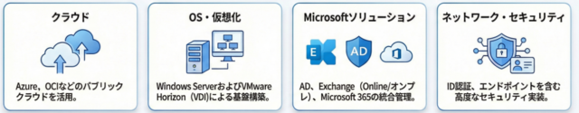 クラウド:Microsoft 365, box, ZoomなどのSaaS、AWS, OCI, Azure などパブリッククラウド