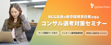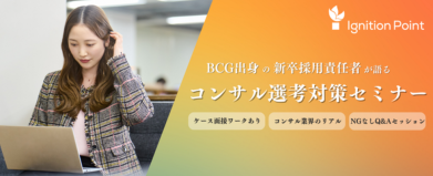 セミナー概要 「コンサルって何?」「ケース対策は何から始めればいい?」 そんな疑問を1時間で解消! BCG出身の新卒採用責任者が、選考で見ている本音と、今から差がつく対策法を余すことなくお伝えします。 ※本セミナー参加者には、サマーインターンの選考優遇特典をご用意しています ■プログラム(予定) コンサル業界のリアル: 華やかなイメージの裏側から、若手が手にする「市場価値」まで 実践!ケース面接ワーク: 当社で実際に使用していた過去問を使い、プロの思考プロセスを体得 選考官の視点: 面接評価の裏側。なぜ、その回答は「落ちる」のか? Q&Aセッション: 業界のことからキャリア相談まで、NGなしで回答します ■こんな方におすすめ ・コンサル業界に興味があるが、何から始めたらいいか分からない方 ・早期に内定へのルートを確保しておきたい方 ・「市場価値の高い人材」を目指す全ての28卒生 登壇者プロフィールとコメント ■登壇者プロフィール 吉丸 達也 イグニション・ポイント株式会社 人事総務部 シニアマネージャー 米国Duke大学 Pratt School of Engineeringを卒業後、ボストンコンサルティンググループに入社。その後、リブ・コンサルティングを経て、スカラのグループ会社の執行役員に就任。現在はイグニション・ポイント株式会社にて人事総務部 シニアマネージャーを務め、グループ全体の組織・事業戦略を統括。また、新卒採用責任者も兼務。 ■コメント 『優秀なのに落ちる学生』と『選ばれる学生』、その差は何か? その答えは、コンサルティングビジネスの『リアル(現場)』を知れば自ずと見えてきます。 また、多くの学生は、小手先のテクニックに走りがちです。しかし、選ばれる学生になるための最短ルートは、業界の本質(仕事のリアル)を理解し、面接官が求める『思考の型』を正しく体得することです。本セミナーでは、この3つを分断せず、一気通貫で『内定へのロジック』としてお伝えします。皆さんとお話しできること楽しみにしています。 ■開催日程 2月 17日 (火曜日)⋅11:00~12:30 2月 25日 (水曜日)⋅11:00~12:30 ※セミナー途中での入退出可能です ■開催形式 オンライン(Zoom) ■その他 ・持ち物: 筆記用具 ・服装:自由(私服で構いません) ■申し込み方法 【応募する】ボタンよりご応募ください。 また、ご応募の際に、 ご希望の参加日程も併せてお知らせください。 ご応募いただきましたら、セミナーの詳細や参加用URLをメールにてお送りいたします! ※エントリーから3営業日を過ぎてもメールが届いていない場合は、以下までお問い合わせください ■問い合わせ先 cons_personnel@ignitionpoint-inc.com (新卒採用担当)