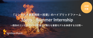 イグニション・ポイントのサマーインターンシップ この度、2028年卒向けにサマーインターンシップを開催する運びとなりました。 イグニション・ポイントのインターンシップでは、既存のコンサルティングファームの事業モデルでは成しえない、当社ならではの「コンサルティング×事業創出×投資」という新たな事業モデルや新規事業の面白さを体感できます。 <サマーインターンシップ開催レポート> https://note.com/ignitionpoint/n/n1f3e2f31f36a 昨年実施したインターン 昨年はイグニション・ポイントの仕事理解はもちろん、現場コンサルタントからのフィードバックをもらい、皆さん自身の成長に繋げることができる濃密な3日間のインターンを実施しました。 ■開催日程 6月~8月に計3回実施 ※3日間のプログラムで、全日程【対面】での実施 ■開催場所 東京オフィスもしくは関西オフィス 東京:東京都渋谷区東1-32-12 渋谷プロパティータワー1F 関西:大阪市北区大深町6-38 グラングリーン大阪北館 JAM BASE 3階 ※遠方からご参加の方は交通費と宿泊費を支給 開催日程・時間・場所など 未定のため、確定次第ご案内いたします。 <イグニション・ポイントの特徴> 「ゆたかな人生のきっかけを」 これが創業以来、世の中をイノベーションによってゆたかにしたい、社員がゆたかさを感じられる会社にしたいという想いを表現したイグニション・ポイントの理念です。 この理念を実現するために、自らがイノベーションの「着火点(Ignition Point)」となり、「ゆたかさを生みだすあらゆる革新のプラットフォームになる」ことを目指しています。 ① 3事業連携の案件 コンサルティング、新事業創発、スタートアップ投資という3つの分野が持つナレッジやネットワークを結集し、それらがなければ実現できないような、社会の変革に向けた案件の取り組みを強化しています。 ② 多様なスペシャリストとのコラボレーションによる新たな事業の創出 新規事業に関する案件は全体の5割程度になり、コンサルタント、エンジニア、デザイナーなどの各領域のプロフェッショナルが連携しながら、新規事業の企画構想からサービス構築、グロースまで一気通貫して顧客に寄り添って伴走できるのが特徴です。 ③ 幅広いキャリアパスを提供できる点 コンサルタントでも、自社発スタートアップやJV、グループ会社の経営者としてのチャンスがあり、経営者/CXO人材としてのキャリアをつくるいくつもの機会や制度、環境が用意されています。 応募条件 <下記2つを満たす方> ・2027年4月以降に大学・大学院を卒業見込みで、28新卒として2027年10月入社もしくは2028年4月入社を希望する方 ・オンラインでの選考およびいずれかのタームにご参加いただける方 選考フロー 説明会参加 エントリーシート提出・書類選考 個人面接(2回) サマーインターンシップ参加決定 ※選考プロセスは変更になる可能性がございます 仕事内容 コンサルタントとして以下のような業務に携わっていただきます。 ※どのコンサルタントとして働いていただくかは選考の中でご希望・適性に応じて決定させていただきます ■新規事業開発×戦略コンサルタント(Strategy & Innovation Unit) クライアントの戦略パートナーとして様々なビジネス機会を創出し、他ユニットと連携しながら戦略策定~成長実行支援まで一気通貫で伴走支援します。 (案件例) ・総合家電メーカーの先端技術等を活用した自社発新規サービスの開発 ・総合商社の新規事業企画、開発支援 ・産官学連携等のオープンイノベーション立ち上げ、運営 等 ■デジタル×戦略コンサルタント(AI Technology Unit) 顧客企業のDX戦略〜実行支援、さらにはDXの先にあるイノベーション(新規事業)の創出の支援も行ってまいります。 「デジタルを駆使したビジネス変革・創出」をテーマにするものが多く、構想~開発・実装フェーズまで一気通貫で支援します。 (案件例) ・医療DX実現のための新規事業立ち上げおよびプロダクトマネジメント支援 ・スポーツ×NFTによる顧客体験価値向上の新規サービス企画・構築支援 ・地方自治体におけるデジタル化ロードマップ支援 等 ■ファイナンス×戦略コンサルタント(Strategy & Finance Unit) 3つのケイパビリティ(戦略・ファイナンス・実行)を強みに、これまでの延長線上の取組みや自社単独の取組みだけでなく、非連続な取組み(M&Aや複数企業とのJV・業務提携、CVC)を駆使し、新規事業の創出・事業バリューアップを支援します。 (案件例) ・大手小売り企業のCVC設立支援 (大手×スタートアップ) ・大手ゼネコン、IT、BPO会社 3社JVの事業構想策定 (大手×大手) 等 ■組織・人事×戦略コンサルタント(People Organization Unit) 事業環境・人材環境の変化を見据えて、事業ポートフォリオの転換/強化を実現するためのPX(People Exchange)支援します。 (案件例) ・消費財メーカーでのワーク・エンゲージメントの向上支援 ・消費財メーカーでの人事制度見直し ・ゼネコンにおける働き方改革プロジェクト 等 イグニション・ポイントでだ