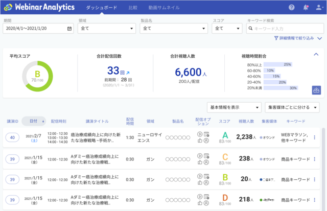また、Web講演会を評価する分析軸として当社独自の採点方法によるスコアリング機能を設け(1~100点までA~E評価)、Web講演会ごとの評価を比較できるようなっており、年間2,300件のWeb講演会の運営をサポートする当社の強みを生かして、講演会ごとのデータを蓄積することにより、自社内の過去データとの比較だけでなく、当該疾患領域における業界全体の平均値を用いてベンチマークとなるスコアリングも可能です。