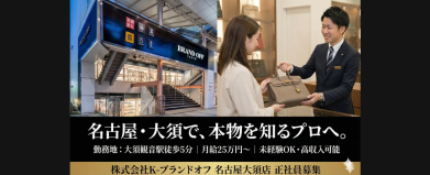 仕事内容 ブランドアイテムの査定・販売・接客をお任せします。 お客様との“会話”を通して信頼関係を築くことが、査定・販売の第一歩です。 当社では、国内外のハイブランド愛好家に対して、誠実な姿勢と確かな商品知識をもって対応します。未経験の方でも、専任トレーナーによるOJT研修や査定講習を通して、着実に成長できる環境が整っています。 ◆具体的な業務内容 ・ブランド品(バッグ・時計・ジュエリー等)の査定・買取対応 ・店頭での販売・接客対応(国内富裕層・外国人観光客など) ・お客様との会話を通じた価格交渉・信頼構築 ・ディスプレイ設計やポップ作成など売場づくり ・商品管理、在庫チェック、入出庫管理 など店舗運営業務全般 「販売するだけ」でなく、“売れる工夫”や“対話の技術”を武器に、 接客のプロフェッショナルとして成長できる環境です。 ◆取り扱いブランド例 エルメス(銀座最大級の在庫数)、ロレックス、シャネル、ルイ・ヴィトンなど 【限定品・コレクション品・レアアイテム】 中古市場でしか出会えない逸品も多数。 バーキン、ケリー、馬具やスケートボードといった特別アイテムまで扱います。 ◆対応顧客層 日本人富裕層、目利きの常連客 英語・中国語対応が必要な観光客 【入社後のステップ】 STEP1:販売・接客のOJTからスタート ブランド知識や接客マナーを基礎から習得 マニュアルや研修動画をもとに、現場での実践を通じて学ぶスタイルです。 STEP2:査定研修(専任トレーナー担当) 真贋判定・相場観・商品状態の見極めを、専門トレーナーのレクチャーと現場経験の両軸で学習 日々の業務の中で学びを吸収していく力が求められます STEP3:査定デビュー 社内テスト合格後に買取カウンターへ 多くのスタッフが半年~1年以内に査定業務を任されています ★銀座本店は高い専門性とスピード感が求められる環境のため、教えられるのを待つのではなく、自ら吸収していく姿勢が活躍のカギになります★ 【キャリアパス】 スタッフ → 査定担当 → 店長・バイヤー → 本部(教育・営業企画・FC本部) 評価は年次や年齢でなく、当社の評価制度でもある「スキル×気持ち」で決まります。 詳しくは当社の採用サイトをご覧ください。面接時には具体的に公開いたします。 ※年収600万以上のキャリアアップ例もあり 【求める人物像】 ・接客・営業などの経験を活かして「次のステージ」に進みたい方 ・ブランド品やファッションに興味がある方 ・会話・商談を通して信頼を築く仕事がしたい方 ・高単価商材を扱いたい、成長意欲のある方 ・語学スキル(英語・中国語など)を活かして働きたい方 ・富裕層・インバウンド対応にも挑戦してみたい方 ・“モノ”ではなく“信頼”を売る仕事がしたい方 【銀座本店について】 K-ブランドオフの旗艦店として、銀座の中心「みゆき通り」に位置するトップクラスの店舗。 高級ブランドショップやリユース店が並ぶ激戦区において、私たちの強みは3点あります。 ① 圧倒的な品揃えと希少性 エルメス専門フロアをはじめ、約1,100点以上のエルメス商品を揃える「銀座最大級」の在庫 バーキン・ケリー・馬具・限定モデル・廃盤コレクションなど、希少価値の高い商材が多数 1階には10万円台から購入できるアイテムもあり、幅広い層に対応 ② インバウンド×情報発信力 銀座の一等地で、国内外の富裕層・観光客からの信頼が厚い SNSを活用し、海外からの問い合わせ・来店も多数 店舗は「ラグジュアリーミュージアム」をテーマに、“見るだけでも楽しい”ワクワクする空間づくりを追求 ③ 専門性と信頼の証 エルメス販売数 日本一の実績を持つ販売員が在籍 AACD加盟・偽造品排除・安心保証制度あり 各種メディアでも取り上げられる知名度と信頼性を誇る店舗 【接客エピソード】 「SNSで見て、あのヴィンテージのバーキンをどうしても見たくて来ました」 ― 来店されたのは、海外からのお客様。担当スタッフが商品の背景や価値を丁寧にご説明すると、 「ここで買えてよかった」と笑顔でお買い上げに。 言語だけでなく“目利き”と“信頼”で勝負する。 それが銀座本店の、接客の真骨頂です。 【求人のまとめ】 ・銀座本店(旗艦店)で、圧倒的スケールのブランド接客ができる ・エルメス・ロレックスなど希少商品を扱い、専門知識が身につく ・SNS発信・外国語対応・美術館のような空間演出など多彩なチャレンジが可能 ・店長やバイヤー、本部職など多彩なキャリアパス ・OJT&査定研修で未経験から“プロ”を目指せる ・語学対応できるスタッフも活躍中(英語・中国語など)