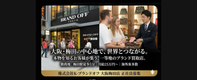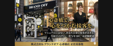 仕事内容 ブランドアイテムの査定・販売・接客をお任せします。 心斎橋店では、マニュアル通りの対応ではなく、お客様の表情や空気を読み取りながら、 「あなた自身の言葉と提案」で信頼を築く接客が求められます。 ◆具体的な業務内容 ブランド品(バッグ・時計・ジュエリーなど)の査定・買取 接客販売業務(国内外のお客様への提案・対応) 査定金額のご案内と納得感のある説明 商品の陳列・ディスプレイ・POPづくり 入出庫や在庫管理を含む店舗運営業務全般 「この商品、今ここに置きたい」── そんなアイデアをすぐに形にできる、現場裁量の大きな環境です。 ◆取り扱いブランド例 ルイ・ヴィトン、シャネル、エルメス、ロレックス など一流ブランド中心 【入社後のステップ】 STEP1:OJTで販売・接客からスタート ブランド知識、商品説明、接客マナーを基礎から学びます STEP2:査定研修(専任トレーナー担当) 真贋判定・相場・状態チェックなど、査定業務の基礎を習得 STEP3:査定デビュー 社内テスト合格後にカウンターへ。半年~1年で査定業務を任されるメンバーが多数 【接客エピソード_感情に寄り添う仕事】 ──「お兄さんになら売ってもいいわ」── そう笑って差し出されたのは、長年愛用されたエルメスのバッグ。 ただ価格を提示するだけでなく、お客様の思い出や感情に寄り添い、 「納得できる言葉」で価値を伝えることが、この仕事の本質です。 【キャリアパス】 スタッフ → 査定担当 → 店長・バイヤー → 本部(教育・営業企画・FC本部) 評価は年次や年齢でなく、当社の評価制度でもある「スキル×気持ち」で決まります。 詳しくは当社の採用サイトをご覧ください。面接時には具体的に公開いたします。 ※年収600万以上のキャリアアップ例もあり 【求める人物像】 ・接客や営業経験を活かしたい方(業界不問) ・人と話すのが好きで、会話に自信がある方 ・ブランド・ファッションへの興味がある方 ・相手の感情に寄り添った接客ができる方 ・「売る」より「聞く」「話す」が得意な方 ▼こんな方にピッタリ! ・アパレル・カフェ・旅行・営業など対人業務経験者 ・接客を“人と向き合う仕事”として捉えている方 【心斎橋店について】 関西の一大商業地・心斎橋に店舗を構える「BRAND OFF 心斎橋店」。 観光客から地元の常連様まで、多様なニーズに応える接客が求められる店舗です。 ・ハイブランドを求める訪日観光客が多数来店 ・長年通う常連のお客様も多く、信頼構築が鍵 ・現場の声を活かしたライブ感のある売場づくりも魅力 【求人のまとめ】 ・常連×インバウンドが交差する心斎橋接客 ・会話から価値を引き出す買取スタイル ・売場づくりにも挑戦できる現場裁量 ・感情に寄り添う「言葉の力」が活きる接客 ・20代中心、互いに学び合うフラットなチーム ・店長やバイヤー、本部職など多彩なキャリアも描ける ・未経験から査定スキルが身につく ・年収500万円以上も可能な評価制度