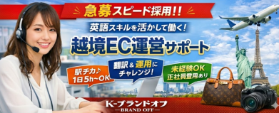 募集背景 株式会社K-ブランドオフは、ブランドリユースのアジアNo.1のグローカルプラットフォームを創造すべく事業の拡大を進めています。 これは、単に売上や企業価値だけを意味するものではなく、モノを「つくる人、繋ぐ人、手にする人の幸せのために」我々は何ができるのかを”最前線”で考え、行動し、実現することで、世界中の方々に必要とされる存在になることを意味します。 その実現のためには、まず仕事を”自らが最前線で楽しむ”ことが重要であり、より業務の推進が必要であり、そのようなブランドリユースビジネスをより推進できるチェンジエージェントを募集しております。 こちらは、これまでのキャリアを元に、株式会社K-ブランドオフで新たなチャレンジをご検討されている方用の応募フォームです。 必要な経験・スキル・能力・マインド 社会人経験3年以上 異文化理解とコミュニケーション能力 歓迎する経験・スキル・能力・マインド 自身の市場価値を高めたい方 社内外で問題なくコミュニケーションが取れる方 リユース事業に興味がある方 様々なことにチャレンジしたい方 安定して働きたい方 注意事項 エントリーされたすべての方に面接の機会をお約束するものではありません。 当社からの打診は「関心があるのでさらに詳しい話をしたい」という申し出であり、採用をお約束するものではありません。通常の選考と同様に、書類選考・面接等がございますので、あらかじめご了承ください。 個別の求人で定める待遇になりますので、ポジションご案内時にお知らせいたします。 【事業部紹介動画(一部)】 それぞれのURLからご視聴ください。 ■店舗事業部 https://www.youtube.com/watch?v=B9RvEQSMBAU ■WEB事業部 https://www.youtube.com/watch?v=P3WhvuaUv4o ■法人事業部 https://www.youtube.com/watch?v=-DH47cPdg24 ■オークション事業部 https://www.youtube.com/watch?v=HeNDhWzjpnA