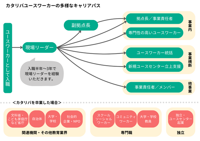 その後のキャリアパスは様々ですが、本人の興味関心や強みを活かせるよう、拠点長や事業責任者を目指したり、新規拠点の立ち上げや他部署兼務などに挑戦したりすることが可能です。また、今後のキャリアアップを見据えて、希望・適性に応じて入職後に同じユースセンターであるb-labなど他拠点での研修や異動の可能性もございます。