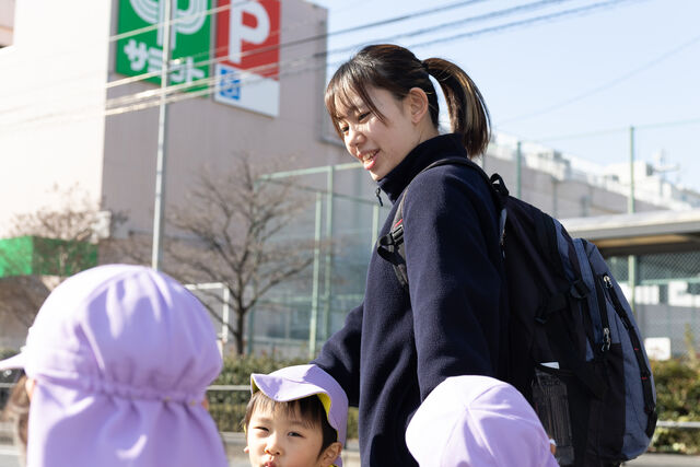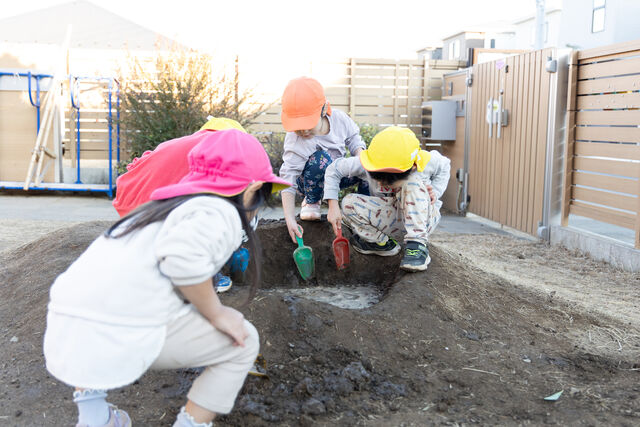 2023年度より、「原体験バス」を導入。各園で子どもたちが自分たちで行きたい場所、やりたいことを相談して出かけています。普段の遊びのなかでも、泥んこ遊びを楽しんだり、散歩時に虫探しに夢中になったり…こどもたちの「やりたい!」をどうやったら叶えられるかを、先生たちは日々最大限考えています。