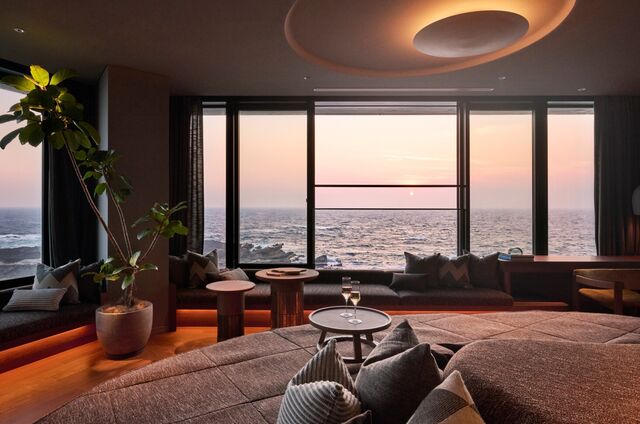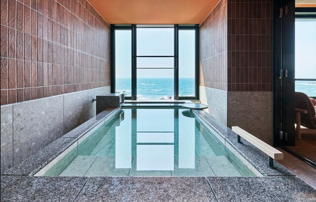 海の向こうに浮かぶ富士山と夕陽の絶景、潮風の香りに包まれれる客室温泉、海の幸を味わうお料理をお愉しみいただくSMALL LUXURY RESORTです