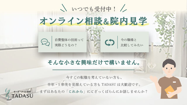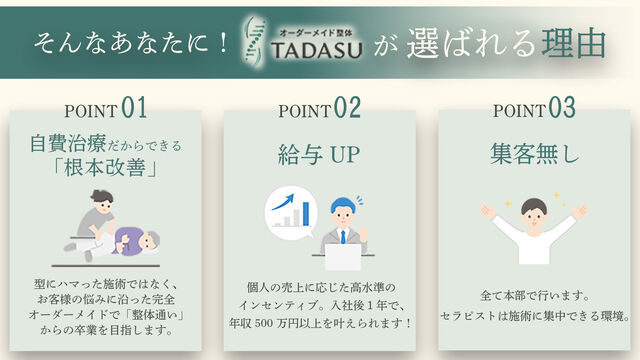 | 職種 / 募集ポジション | 【業務委託】求人媒体:オーダーメイド整体TADASU |