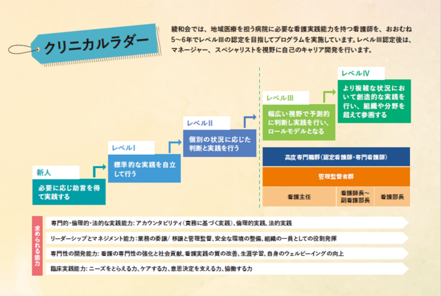 クリニカルラダーの各ステップの必須研修は院内off-JTだけでなく、オンライン研修のE-learningで自分の好きな時間に学ぶことができます。