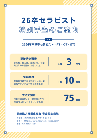 | 職種 / 募集ポジション | 医療法人社団広恵会_春山記念病院_常勤_セラピスト_26新卒 |