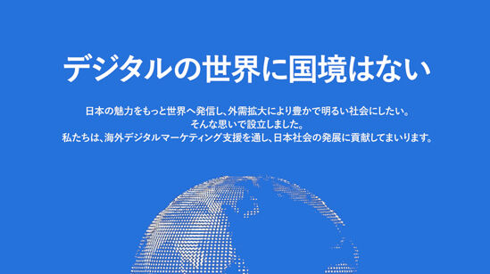私たちは、海外デジタルマーケティング支援を通し、企業の成果創出を実現しDX投資のROI最大化に貢献するとともに、日本社会の発展に貢献してまいります。