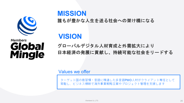 | 会社概要 | ■社名:株式会社メンバーズ(英文名称 :Members Co.,Ltd.) ■カンパニー名:グローバルミングルカンパニー ■事業内容:越境EC・インバウンド事業に特化した海外デジタルマーケティング支援 ■カンパニー社長:近藤 由彩(kondo.yukia) ■設立:2024年4月1日 詳細は当社ホームページをご覧ください https://globalmingle.members.co.jp/ |