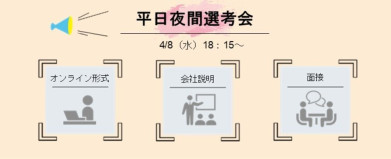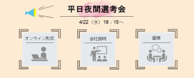 2025年4月22日(水)18:15~ オンラインにて平日夜間選考会を開催します。 全てオンラインのため、ご自宅からご参加いただけます。面接開始5分前までに出席が確認できなかった場合は面接をキャンセルさせていただきます。ご参加枠に限りがございますので、当日キャンセルの無いようお願いいたします。 選考ポジション:PMOコンサルタント(PM事業部) 書類応募〆切:2026年4月20日(月)18時 <当日スケジュール> 18:15~18:25 :選考会フロー説明 18:30~21:00 :面接(約50分/回・1~2回) ※1次通過者は、同日に2次面接実施となります。(選考状況により、後日の選考をご案内することがあります) <今後のフロー> ・本求人票にてご推薦、ご応募をお願いします。 ・随時書類選考 ・応募〆切:2026年4月20日(月)18時 ・当日のご案内:随時 ・WEB適性検査受験 ご参加枠は10人程度のため、定員になり次第、締め切らせていただきますので何卒ご了承下さい。 是非ご応募をお待ちしております。よろしくお願いいたします。