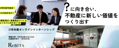 リビタはリノベーションを専門に幅広い領域の不動産事業を展開している総合不動産デベロッパーです。 単にリノベーションの技術を提供するだけではなく、時代の変遷と共に、新たなソリューションを生み出してきました。住む・旅する・働く・集うといった日々の暮らしにまつわるさまざまな領域で独自性のある事業を展開しています。 リビタでは 「次の不動産の常識をつくり続ける」 というビジョンに共感し、 好奇心と感性豊かに、変わりゆく社会に対して共に新たな価値を創造することに挑戦したい 、という方に新たな仲間として加わっていただきたいと考えています。 今回は、社員との座談会やワークを通して、顧客視点×事業視点でつくるビジネスに向き合うことのできるプログラムです。あなたの挑戦をお待ちしています! 実施概要 ・ 日程:2026年2月6日(金)15:00-18:00 ・実施方法:オンライン(zoom) ・参加条件:27卒・全学部学科対象・終日参加が可能な方 ・エントリー方法:本ページ「応募する」よりエントリーシートを提出 ・応募締め切り:2026年1月26日(月) ※本インターンシップ実施後は参加された方を対象とした 特別選考(総合職)をご案内予定 ◆ リビタの事業紹介・新卒採用募集要項は【27新卒プレエントリーページ】よりご確認ください コンテンツ 1.「知る」「関わる」|会社紹介、質問会、社員座談会 リビタの幅広い事業やサービス・ブランドについて、想いやビジネスモデルを含め、お伝えします。質問会・座談会で、ぜひあなたの気になることを直接聞いてみてください。 2. 「事業企画ワーク」|実践グループワークと現場社員によるフィードバック 「暮らし」「不動産」にまつわるプラン・ビジネスモデルを、市場のニーズと収益性(事業性)を追求しながら具体化していただきます。市場のニーズを読み解き、顧客に響く企画をし、事業として成立させる。これがリビタ社員に求められる、事業推進力です。 プレゼンには、不動産投資事業の最前線で活躍する社員から、実践的なフィードバックがあります。 ※以上のコンテンツ内容は今後変更となる可能性があります 参加社員 分譲事業|区分マンション推進担当、販売担当 若手~中堅社員 人事担当 ほか こんな方におすすめ プロジェクトの全工程(仕入れ~販売)で責任と裁量を持って推進したい 自ら企画したものを「自分ごと」として、若いうちから市場へ仕掛けていきたい 販売だけでなく、事業全体(企画・仕入れ・マーケティング)を動かす営業の醍醐味を知りたい 「社会貢献性」と「収益性」の両立を追求できるビジネスモデルを設計したい PDCAを回し、圧倒的な成長スピードで市場にインパクトを与えたい 募集人数 20名程度予定 参加者発表 ご応募から2週間以内にメールにて個別にご連絡予定 ※応募者全員にご連絡をいたします 応募方法 青色の「応募する」ボタンより必要事項を入力の上、エントリーしてください。 その他 服装は自由です。 画面・音声ONで終日参加可能な環境からご参加ください。 続きを見る