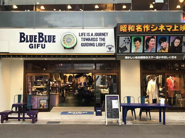 岐阜・柳ヶ瀬商店街の中に残る、なつかしい昭和スター達の肖像画が並ぶ映画館の1階にあるBLUE BLUE GIFUは、『複数のオリジナルブランドとこだわりのインポートブランドをミックスした直営店』の一つとして、地域に根差した運営をしています。