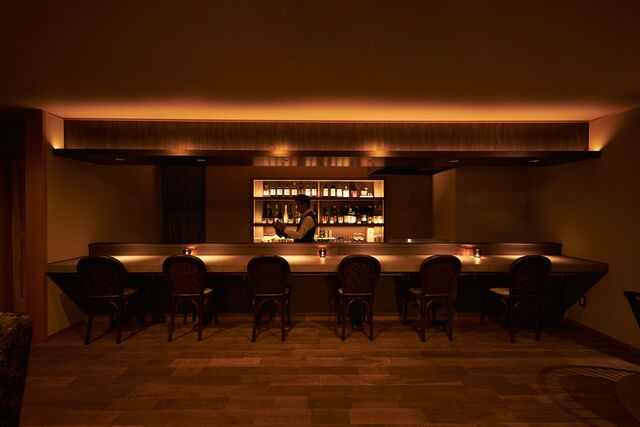 敷地内には、日本酒bar「穏坐bar」もございます。 17時から23時まで営業する大人の隠れ家的空間となっております。 カウンター6席、テーブル6席の空間からは、 ライトアップされた中庭の庭園を眺めることができます。