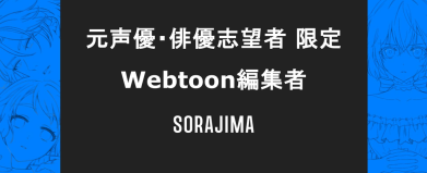 みなさん、はじめまして! 株式会社ソラジマ・代表取締役の前田です。 私たちは現在、世界的な大ヒット漫画を生み出すため、少年マンガ編集部を立ち上げています。 その立ち上げメンバーとして、マンガ編集者を全力で募集しています。 なぜ、あえて「元声優/役者志望者」なのか。 それは、あなたがこんな経験をしてきたからです。 ・もっとできたはずだと、自分を責めた日 ・目指していた役に届かず、涙した夜 ・結果が出なくても、自分を信じて努力を続けた日々 そして同時に—— ・大勢の人を喜ばせたい。 ・子供の頃に感動した、あの物語を作る一員になりたい。 ・エンタメの道で食っていきたい。 「エンタメで生きたい」という本心は、 簡単に消えるものではないはずです。 その執念は、 漫画編集者として裏方に立った時、必ず武器になります。 実際に弊社では、 元役者から未経験で漫画編集者になり、 次々とヒット作品を生み出し、社内トッププレイヤーとして活躍しています。 では、彼ら/彼女らには何があったのか? それは 「執念」と「行動力」と「思いやり」 です。 作品がヒットしないことはいくらでもあります。 それでも何度でも立ち上がる執念。 作品をヒットさせるためにどんなことでもやり切る圧倒的な行動力。 実際に作品を描く作家の立場に立って考え、寄り添える思いやり。 必要なのは、それだけです。 今も心のどこかで、 「またあの頃のように、でかい夢を追いかけたい。」 「人を夢中にさせる刺激と興奮を、もう一度味わいたい。」 まだそう思えるなら、ぜひ飛び込んできてください。 ここは、年齢も学歴も関係なく、 ヒットと実績で評価される世界です。 人生は一度きりです。 「このまま終わりたくない」と思っているなら、迷わず応募してください。 ぼくたちと一緒に、大きな夢を追いかけませんか。 株式会社ソラジマ 前田儒郎 選考基準 この選考に、御託はいりません。実力だけの真っ向勝負です。 大学中退、元芸人、元声優、夜職、現場仕事など、現職/学歴は問いません。 毎月開催される「仮連載会議」で、自らプロデュースしたネームを通過させる。 通過=即、漫画編集者として「内定」。 その作品は、2027年春リリースのアプリで、あなた自身の最初の連載作品として世に出ます。 こんな人は、マッチしないと思います ・「業務」をこなしに来る人 ・「正解」を欲しがる人 ・「他人の評価」を気にする人 具体的な業務内容 ・連載にむけた作品の立ち上げ業務: 制作チーム結成、ストーリー構成決め、企画書作成、ロゴ作成、キービジュアル作成 ・制作ディレクション: 制作工程の管理(ネーム, 人物線画, 人物着彩, 背景, 仕上げ)をクリエイターさんと実施します ・チームメンバーマネジメント: 制作チームの管理(人事評価, 良好な協力関係を築く) ・分析、次の作品へ : 納品した作品がどの層にヒットしたかなどを分析し新たなヒット作品を生み出すために上記の流れを繰り返します。 ソラジマのウェブトゥーン作品一覧:https://sorajima.jp/works