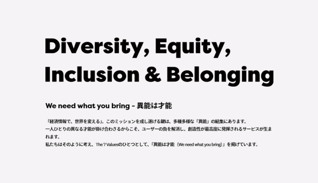 ユーザベースは企業バリューのひとつとして、そして解決すべきマテリアリティのひとつとして、「異能は才能」を掲げています。メンバー1人ひとりが才能を発揮して働ける会社にしていくために、DEIB(Diversity, Equity, Inclusion and Belonging)の活動をDEIB Committeeを中心に全社で推進している活動状況を紹介しています。
