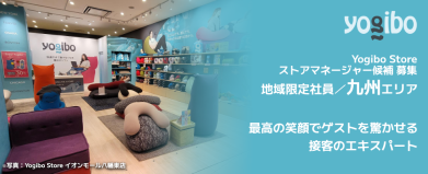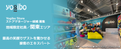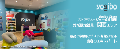 【私たちのストーリーとカルチャー】 初めてYogiboに包まれた瞬間、思わず「すごい!」と驚いたのを今でも覚えています。 どんな体勢でも自然にフィットし、今まで体験したことのない心地よさに包まれる魔法のソファ。 「この感動を、もっと多くの人に届けたい」 この想いでストアのキャストたちとブランドを創り上げ、今では全国約100店舗へと拡大しました。 韓国・台湾・タイ・シンガポールなどアジア諸国での代理店展開を経て、2021年にはついにアメリカ本社を買収。今まさに「日本から世界へ」というビジョンが本気で実現しようとしています。 私たちの根底にあるのは 「仕事を遊ぶ」 という文化です。 人生の多くの時間を費やす仕事が、つまらないのはもったいない。どうせやるなら遊ぶように、面白いことをやってやろう。遊びと同じように、仕事にも本気で取り組むからこそ楽しい。 Yogiboには、そんな本気で楽しめる環境が揃っています。 募集背景:好きな街でYogiboファンを増やしませんか? ブランドの成長に伴い、全国で採用のチャンスが広がっています。 「住み慣れた街で長く働きたい」「地元にYogiboのワクワクを届けたい」という想いに応える【地域限定社員】の募集です。転居を伴う転勤はありません。 2025年に続き、2026年も関東・東海・関西・九州エリアを中心に、地域を盛り上げてくれる仲間を30名以上募集します!「良いモノを売りたい」「地元のお客様を喜ばせたい」と本気になれるあなただからこそ、腰を据えて大きく成長できるステージがここにあります。 仕事内容:驚きと感動に満ちた、地域に愛される空間づくり Yogibo Storeのストアマネージャー候補として、ストアの管理・運営をお任せします。 最初から全てを完璧にこなす必要はありません。頼れる先輩マネージャーやエリアマネージャーがしっかりサポートするので、一歩ずつ成長していきましょう! <具体的なステップと業務> まずはサブマネージャー(副店長)としてスタートし、接客や売上管理などを学びます。早ければ入社から半年以内でストアマネージャーへステップアップするチャンスも! ・ゲスト(お客様)対応 ただ商品を売るのではなく、「体験」を届ける接客スタイルです。商品の魅力や使い方のご提案を通して、一人ひとりのゲストに“ワクワク”と“感動”を提供します。 ・魅力的な売り場づくり(VMD) 売れ筋や季節に合わせた売場づくりや、商品配置の工夫もあなたのアイデア次第。適切な商品在庫を維持するための発注・在庫管理も重要な役割です。 ・キャストの育成・チームづくり 一緒に働くアルバイト(キャスト)の採用や育成もお任せします。それぞれの得意なことを引き出し、チーム全体で高め合う最高のチームをつくってください。 ・売上管理や分析 「どうすればもっと喜んでいただけるか」を数字と向き合いながら探り、売上アップの施策を企画・実行します。 ・ストアのオペレーション改善 働きやすさや業務効率化のためのアイデアは大歓迎!現場の声から新しいルールや仕組みが生まれる環境です。 応募資格:あなたの経験が、地元のYogiboを進化させる ホテルやテーマパーク、小売店等での接客コミュニケーションが好きな方を歓迎します。 <必須> ・小売、アパレル系での販売経験や、テーマパークなどでの接客経験をお持ちの方 ・新卒、既卒3年未満の方は、未経験でも大歓迎! <歓迎> ・店長や店長候補としてのご経験(3年以上の経験優遇) ・裁量を持って働きたいと思っている方 <こんな方をお待ちしています!> ・好きな街、思い入れのある地域で長くキャリアを築きたい方 ・テーマパークのような、ワクワクする体験型の空間が好きな方 ・明るく笑顔で、ゲストとのコミュニケーションを愉しめる方 ・ショッピングモールなどの商業施設が好きな方 ・「まずは行動!」が性に合っている方 ・より良くするための業務改善を考えるのが好きな方 職場環境・やりがい 活気あふれるチーム(社員平均年齢:35歳) 10代の学生アルバイトから50代まで、幅広い世代がチームワークを発揮して働いています。 刺激たっぷりの合宿研修! 半年に一度、全国のマネージャー陣が集まる2日間の合宿を実施。マネジメント研修や表彰式のほか、Yogiboを使ったユニークなレクリエーションもあり、楽しみながら実践的に学ぶことができます。普段は自分の地域で働きながらも、全国の仲間と「こんなやり方もアリだね!」とアイデアを共有し合える最高の機会です。 【キャリアパスと待遇イメージ】 転居を伴う転勤がないため、将来のライフプランを描きながら安心して長く働ける環境です。研修後はサブマネージャーからスタートし、将来的には地域を牽引するストアマネージャーを目指します。 ・年収例 380万円(入社2年目・ストアマネージャー) 月給27万円 + 賞与 + インセンティブ ▼その他のエリアも募集中です 地域限定社員/関東エリア https://hrmos.co/pages/yogibo/jobs/0001010705 地域限定社員/東海エリア https://hrmos.co/pages/yogibo/jobs/