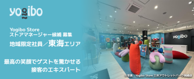 【私たちのストーリーとカルチャー】 初めてYogiboに包まれた瞬間、思わず「すごい!」と驚いたのを今でも覚えています。 どんな体勢でも自然にフィットし、今まで体験したことのない心地よさに包まれる魔法のソファ。 「この感動を、もっと多くの人に届けたい」 この想いでストアのキャストたちとブランドを創り上げ、今では全国約100店舗へと拡大しました。 韓国・台湾・タイ・シンガポールなどアジア諸国での代理店展開を経て、2021年にはついにアメリカ本社を買収。今まさに「日本から世界へ」というビジョンが本気で実現しようとしています。 私たちの根底にあるのは 「仕事を遊ぶ」 という文化です。 人生の多くの時間を費やす仕事が、つまらないのはもったいない。どうせやるなら遊ぶように、面白いことをやってやろう。遊びと同じように、仕事にも本気で取り組むからこそ楽しい。 Yogiboには、そんな本気で楽しめる環境が揃っています。 募集背景:好きな街でYogiboファンを増やしませんか? ブランドの成長に伴い、全国で採用のチャンスが広がっています。 「住み慣れた街で長く働きたい」「地元にYogiboのワクワクを届けたい」という想いに応える【地域限定社員】の募集です。転居を伴う転勤はありません。 2025年に続き、2026年も関東・東海・関西・九州エリアを中心に、地域を盛り上げてくれる仲間を30名以上募集します!「良いモノを売りたい」「地元のお客様を喜ばせたい」と本気になれるあなただからこそ、腰を据えて大きく成長できるステージがここにあります。 仕事内容:驚きと感動に満ちた、地域に愛される空間づくり Yogibo Storeのストアマネージャー候補として、ストアの管理・運営をお任せします。 最初から全てを完璧にこなす必要はありません。頼れる先輩マネージャーやエリアマネージャーがしっかりサポートするので、一歩ずつ成長していきましょう! <具体的なステップと業務> まずはサブマネージャー(副店長)としてスタートし、接客や売上管理などを学びます。早ければ入社から半年以内でストアマネージャーへステップアップするチャンスも! ・ゲスト(お客様)対応 ただ商品を売るのではなく、「体験」を届ける接客スタイルです。商品の魅力や使い方のご提案を通して、一人ひとりのゲストに“ワクワク”と“感動”を提供します。 ・魅力的な売り場づくり(VMD) 売れ筋や季節に合わせた売場づくりや、商品配置の工夫もあなたのアイデア次第。適切な商品在庫を維持するための発注・在庫管理も重要な役割です。 ・キャストの育成・チームづくり 一緒に働くアルバイト(キャスト)の採用や育成もお任せします。それぞれの得意なことを引き出し、チーム全体で高め合う最高のチームをつくってください。 ・売上管理や分析 「どうすればもっと喜んでいただけるか」を数字と向き合いながら探り、売上アップの施策を企画・実行します。 ・ストアのオペレーション改善 働きやすさや業務効率化のためのアイデアは大歓迎!現場の声から新しいルールや仕組みが生まれる環境です。 応募資格:あなたの経験が、地元のYogiboを進化させる ホテルやテーマパーク、小売店等での接客コミュニケーションが好きな方を歓迎します。 <必須> ・小売、アパレル系での販売経験や、テーマパークなどでの接客経験をお持ちの方 ・新卒、既卒3年未満の方は、未経験でも大歓迎! <歓迎> ・店長や店長候補としてのご経験(3年以上の経験優遇) ・裁量を持って働きたいと思っている方 <こんな方をお待ちしています!> ・好きな街、思い入れのある地域で長くキャリアを築きたい方 ・テーマパークのような、ワクワクする体験型の空間が好きな方 ・明るく笑顔で、ゲストとのコミュニケーションを愉しめる方 ・ショッピングモールなどの商業施設が好きな方 ・「まずは行動!」が性に合っている方 ・より良くするための業務改善を考えるのが好きな方 職場環境・やりがい 活気あふれるチーム(社員平均年齢:35歳) 10代の学生アルバイトから50代まで、幅広い世代がチームワークを発揮して働いています。 刺激たっぷりの合宿研修! 半年に一度、全国のマネージャー陣が集まる2日間の合宿を実施。マネジメント研修や表彰式のほか、Yogiboを使ったユニークなレクリエーションもあり、楽しみながら実践的に学ぶことができます。普段は自分の地域で働きながらも、全国の仲間と「こんなやり方もアリだね!」とアイデアを共有し合える最高の機会です。 【キャリアパスと待遇イメージ】 転居を伴う転勤がないため、将来のライフプランを描きながら安心して長く働ける環境です。研修後はサブマネージャーからスタートし、将来的には地域を牽引するストアマネージャーを目指します。 ・年収例 380万円(入社2年目・ストアマネージャー) 月給27万円 + 賞与 + インセンティブ ▼その他のエリアも募集中です 地域限定社員/関東エリア https://hrmos.co/pages/yogibo/jobs/0001010705 地域限定社員/関西エリア https://hrmos.co/pages/yogibo/jobs/