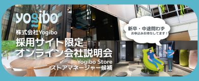 【Yogiboオンライン会社説明会】 「Yogiboのストアマネージャーに興味がある!」 「実際のところ、どんな働き方なの?」 そんな方に向けた、カジュアルなオンライン会社説明会を開催いたします。 「まずはどんな会社か知りたい」「とりあえず話を聞いてから選考に進むか決めたい」というスタンスで全く問題ありません!少しでもYogiboにご興味があれば、ぜひお気軽にお申込みください。 【当日のプログラム(約1時間)】 ○会社紹介(30分) ・会社概要 ・事業概要 ・組織制度(研修制度/キャリアパス/地域限定社員など) ・選考情報(求める人物像/選考フロー) ○質疑応答(30分) 1枠1~3名までの少人数制なので、和やかな雰囲気です。 「実際のところお休みは取りやすい?」「未経験からでも本当に店長になれる?」など、ざっくばらんに何でもご質問ください!NGなしでホンネでお答えします。 【実施概要】 実施場所: オンライン(Microsoft Teamsを使用) ※全国どこからでもご参加いただけます。ご自宅からリラックスしてご参加ください。 ※服装自由(私服でOK) 実施日程: [応募する] ボタンより、実施日程をご確認いただけます。 ※参加希望日程を複数ご選択の上、お申込みください。 ※1枠につき1~3名までの少人数制です。 ※日程は随時更新いたします。 募集ポジション:ストアマネージャー候補について Yogibo Storeのストアマネージャー・エリアマネージャーとして、ストアの管理・運営をお任せします <ミッションは「感動体験」を届けること> 座った瞬間にフィットする魔法のソファ『Yogibo』。 ただモノを売るのではなく、Yogiboを通じた「サプライズ」と「ワクワク」を提供する空間づくりをお任せします。 <主な業務内容> ・ゲスト(お客様)対応、体験型の接客 ・魅力的な売り場づくり(VMD) ・キャスト(店舗スタッフ)の育成、チームマネジメント ・売上・KPI管理、分析 ・ストアのオペレーション改善、仕組み化 など あなたとオンラインでお会いできるのを楽しみにしています! <動画>Yogiboブランドを統一するエリアマネージャーの仕事とは? https://www.youtube.com/watch?v=Rd6mBWDP-FI